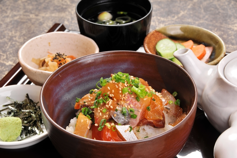 メニュー:よくばり定食(鰤漬け丼もしくはマグロ丼+チキン南蛮)